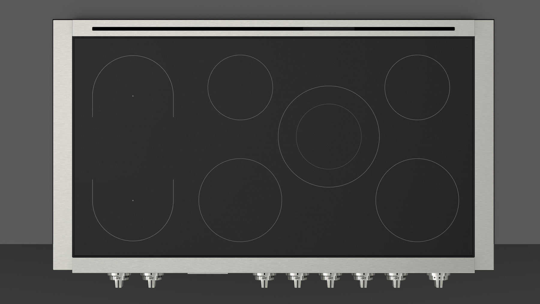 Like its range equivalent, this elegantly designed 48” induction range top is our first all-electric pro range top alternative in this size for those who do not have access to gas or choose to go full electric. The cooking surface features 7 powerful premium European inductors under a continuous piece of ceramic glass adding to the elegant design. Not only does this layout feature the same beloved configuration of our 36” induction range but includes a dedicated bridge element, which when put into bridge function, allows one to combine both induction zones into one large zone for use with specialty cookware or an induction-capable griddle. The instant response and precise control of the induction are ensured by the presence of professional control knobs.